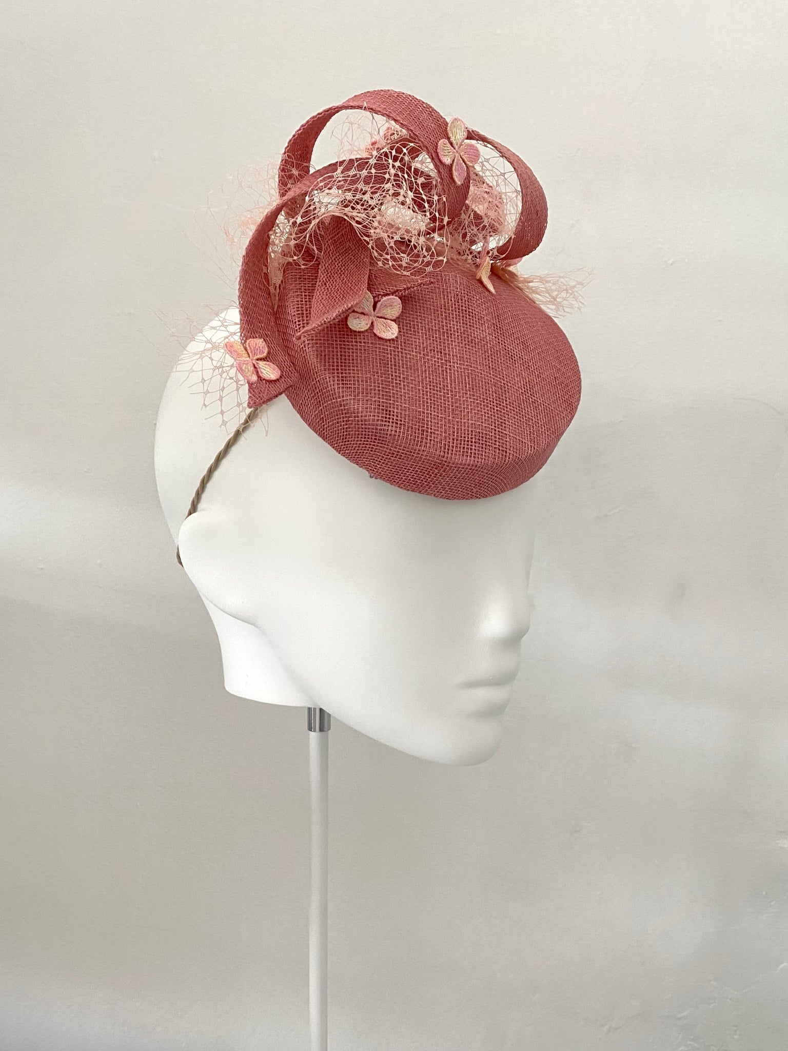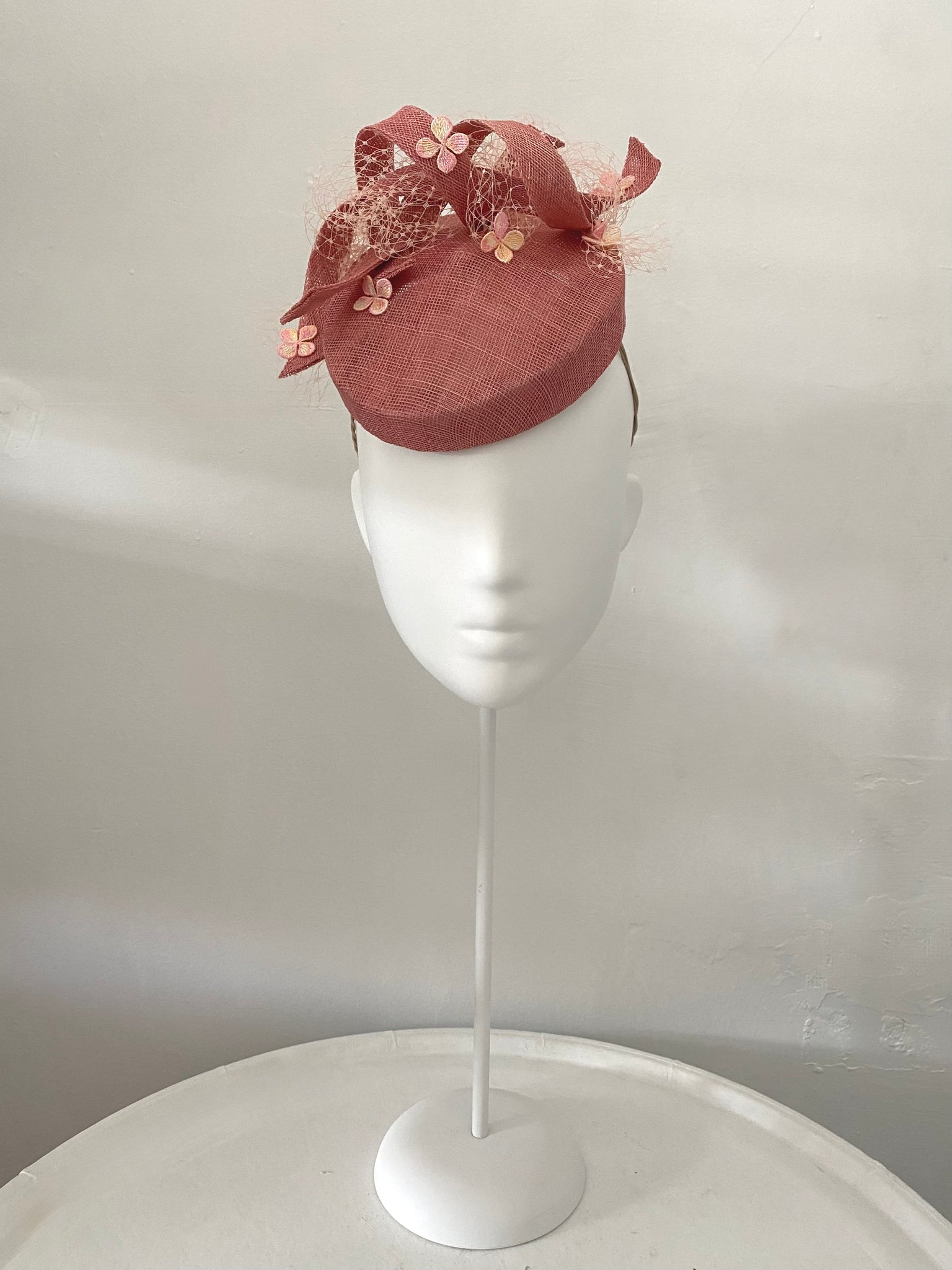 Such a pretty addition to any hat lovers collection. Subtle pale pink and yellow lace flowers are nestled in amongst sinamay swirls and veiling.